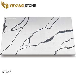 Quartz Code: NT345 Quartz Collection: Calacatta Quartz Slabs Quartz Slabs Color: White with bold black veining Style: High-contrast marble-look Perfect for those who embrace strong visual contrast, NT345 makes a confident and contemporary design statement.