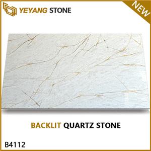 Product Code: B4112 Quartz Collection: Backlit Quartz Slabs Color: Translucent White with Golden Grey Veining Style: Artistic, Luxury Perfect for those who seek dramatic lighting effects, B4112 creates atmosphere through light and texture.