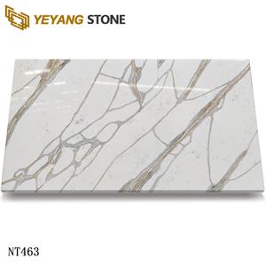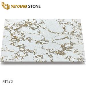 Product Code: NT473 Collection: Calacatta Quartz Slab Color: White with Arabescato golden veins Style: Luxurious Elegance Calacatta quartz stone slab NT473: Rich gold veins redefine modern luxury.